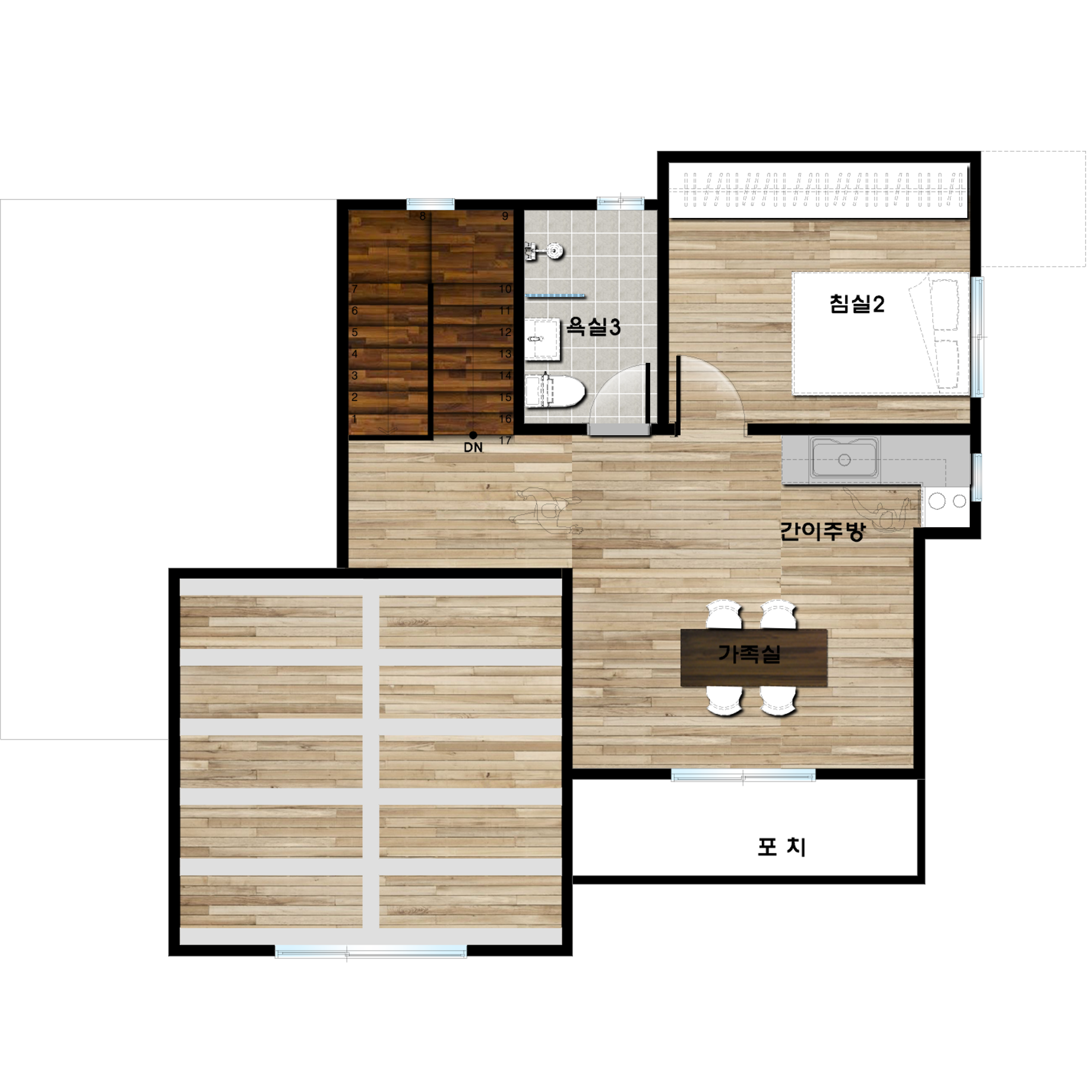 2층으로 올라가는 계단을 가까이 배치하여 동선을 최소화하여 디자인 했다.