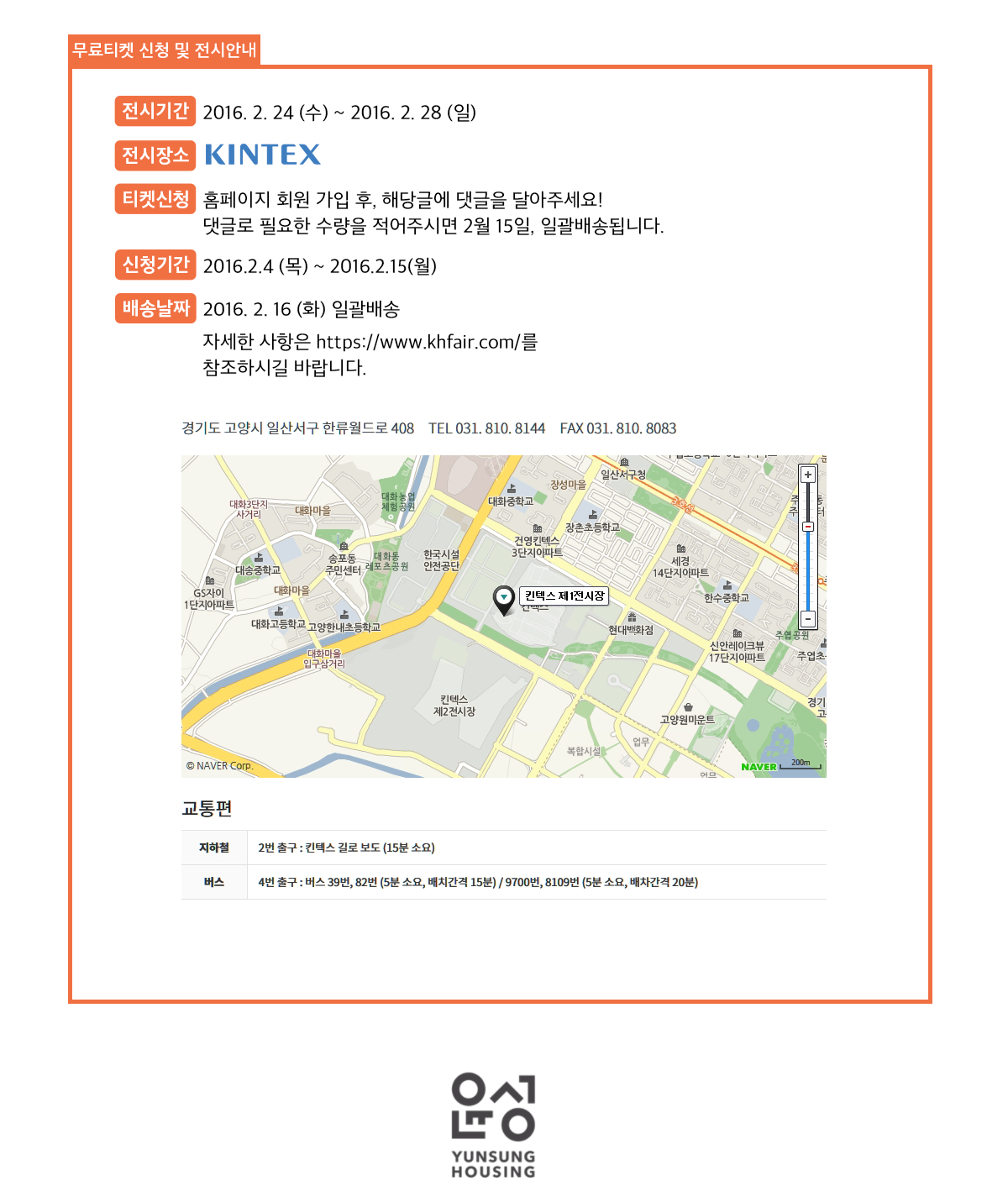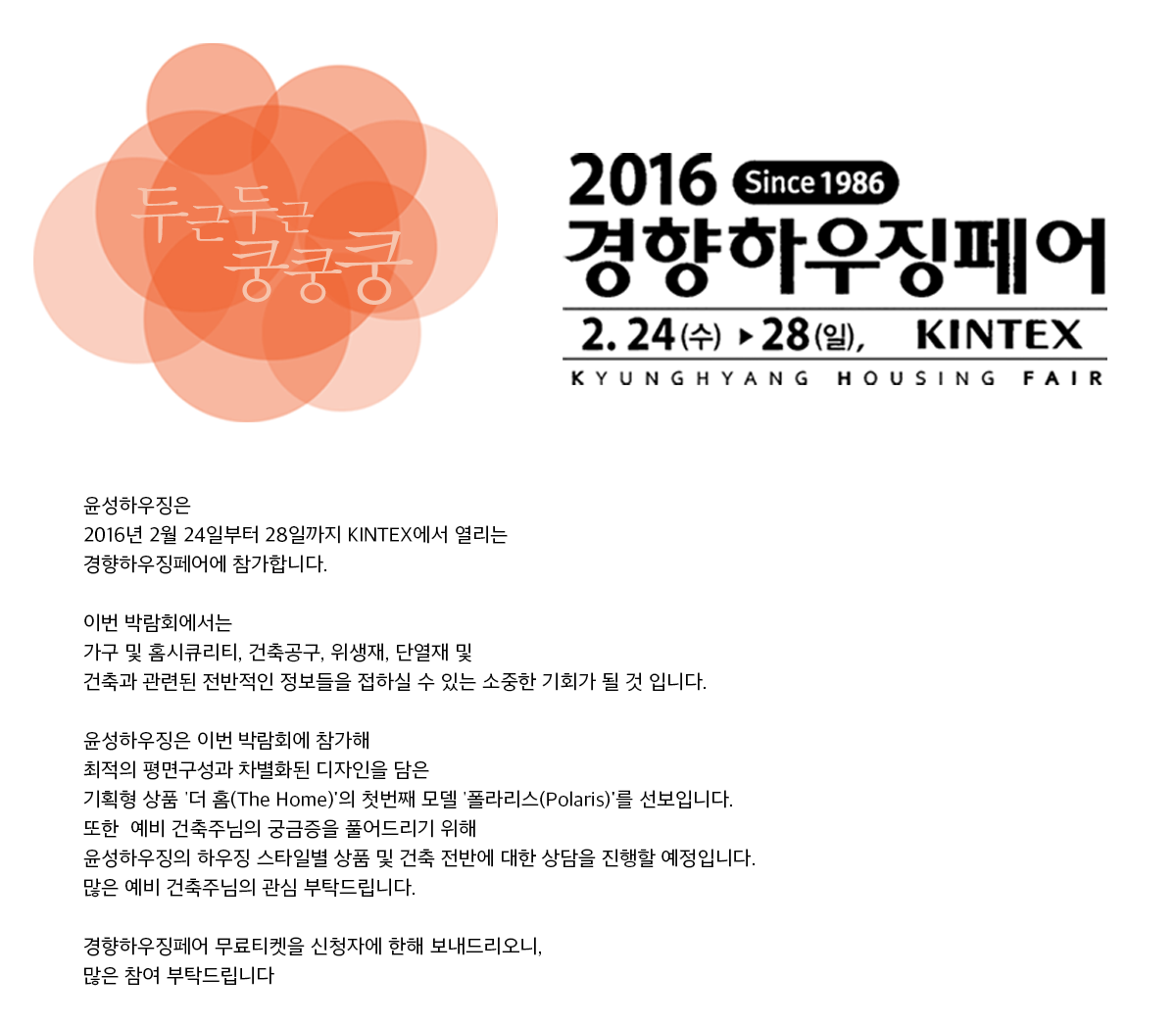 All 바른 생각으로 All 바른 공간을 창조하는 윤성하우징입니다. 티켓 신청 감사합니다. ^^ 차주 초에 일괄발송해 드리겠습니다. 경향하우징페어 윤성하우징 부스에서 꼭 뵈어요 ! 감사합니다.